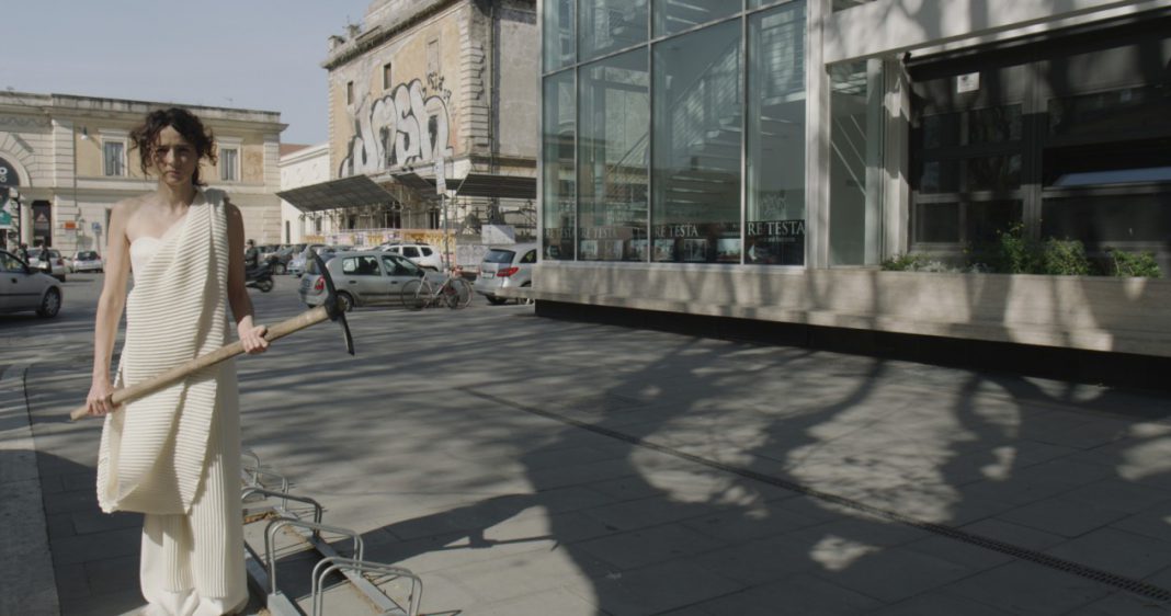 Una donna: Anima in pena, si aggira tra Roma e Terracina, dove vive l’anziano padre. Vaga tra campagne, mare e città, con un letto e in pigiama. Spesso con un piccone in mano, vorrebbe distruggere la nuova architettura che ha tradito i suoi ricordi. Il rapporto con il tempo e la memoria è motivo di struggimento per lei, unico personaggio lucido del film, il più sofferente. Comunica solo con adolescenti e anziani, compreso suo padre, li interroga sull’infanzia la morte, il sesso, attraverso delle provocazioni, degli stimoli anche fisici. Il corpo e i luoghi diventano sogni, incubi, ricordi. Una intimità tanto personale quanto universale.