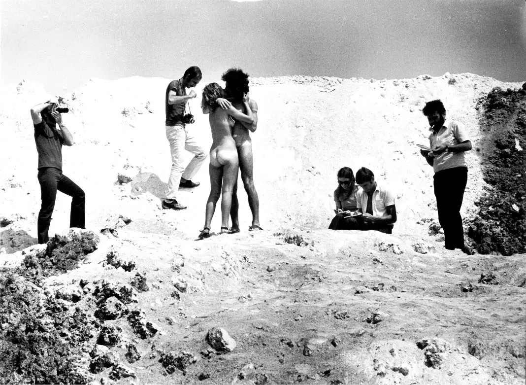 «Il luogo era una discarica, i cumuli pulverulenti avevano colorazioni che andavano dal bianco abbacinante, al violetto, al rossiccio. I personaggi ancora una volta un ragazzo e una ragazza che non si erano mai visti prima di quell’occasione, entrambi avvenenti e che non erano al corrente di quel che avrebbero dovuto fare. Doveva essere una sorpresa anche per loro e così è stato. Chiedemmo ad entrambi di spogliarsi e di baciarsi. Accettarono. E in un silenzio tombale, carico di tensione cominciammo a girare su una collinetta di residui. I ragazzi iniziarono a baciarsi circondati da operatori, fotografi e qualche giornalista. Era una giornata di luglio caldissima, si sentiva solo il ronzio della cinepresa, il clic dei fotografi e i latrati dei cani in lontananza. Ci si poteva amare in un ambiente così ostile e violento?»