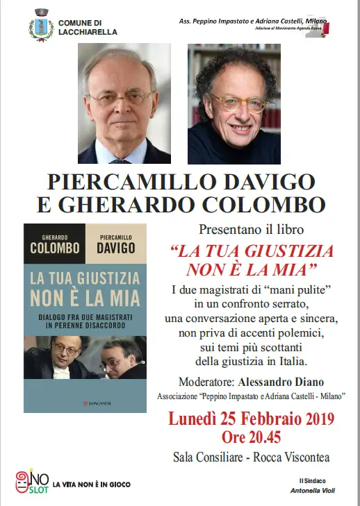 Lunedì 25 Febbraio 2019 alle h.20:45 presso la Rocca Viscontea di Piazza Risorgimento 25 a Lacchiarella (MI), con la presenza dei due autorevoli autori verrà presentato il libro “La tua giustizia non è la mia” di e con Gherardo Colombo e Piercamillo Davigo.