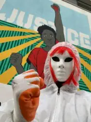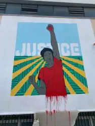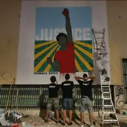 L’opera di Laika, un murales che raffigura Soumaila Sacko con sullo sfondo la parola “Justice” è un grido di rivolta e denuncia, realizzato in via Efeso, nel quartiere San Paolo, sul muro del Mercato Ostiense.