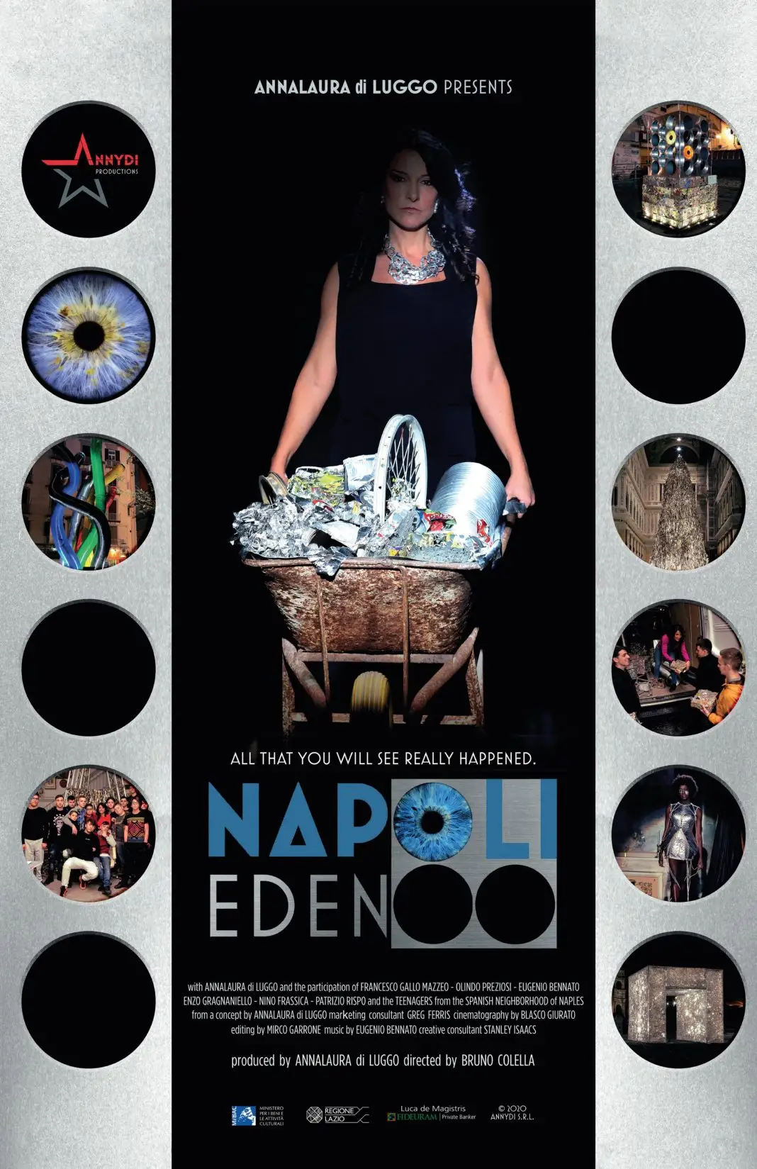 Annalaura di Luggo è un’artista che ama le sfide: alle prese con la sua ultima avventura e tra mille difficoltà tecniche e burocratiche, non si perde d’animo. Vuole realizzare quattro monumentali sculture in alluminio riciclato da installare nei luoghi più significativi della città di Napoli come simbolo di rinascita e riscatto. La necessità di un confronto con la città e con la sua stratificazione sono l’input da cui nascerà il progetto artistico e documentaristico “Napoli Eden”, volto a sensibilizzare, attraverso il linguaggio dell’arte, sull’importanza della tutela dell’ambiente e sull’inclusione sociale. Così, un colorato manipolo di “scugnizzi” dei Quartieri Spagnoli si troverà coinvolto dalla protagonista nella costruzione di uno stupefacente albero fatto di scarti in alluminio e lo stesso materiale di risulta si trasformerà in abiti scultura che appariranno magicamente nella storia. Vedremo Annalaura intrufolarsi disinvoltamente nei vicoli suscitando incomprensioni della gente del posto disarmata dalla lucida follia e dall’estro creativo dell’artista la quale darà vita ad un’emozionante esperienza destinata a lasciare un segno! Tutto questo è successo davvero!