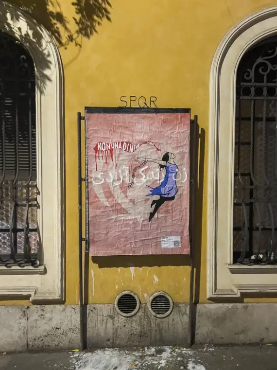 Se lo avete perso, all’alba del 24 novembre 2022, alla vigilia della Giornata internazionale per l’eliminazione della violenza contro le donne è apparso un poster di Laika sui muri della città di Roma, in via Torino (angolo via Cavour), che rappresente un omaggio alle donne iraniane.